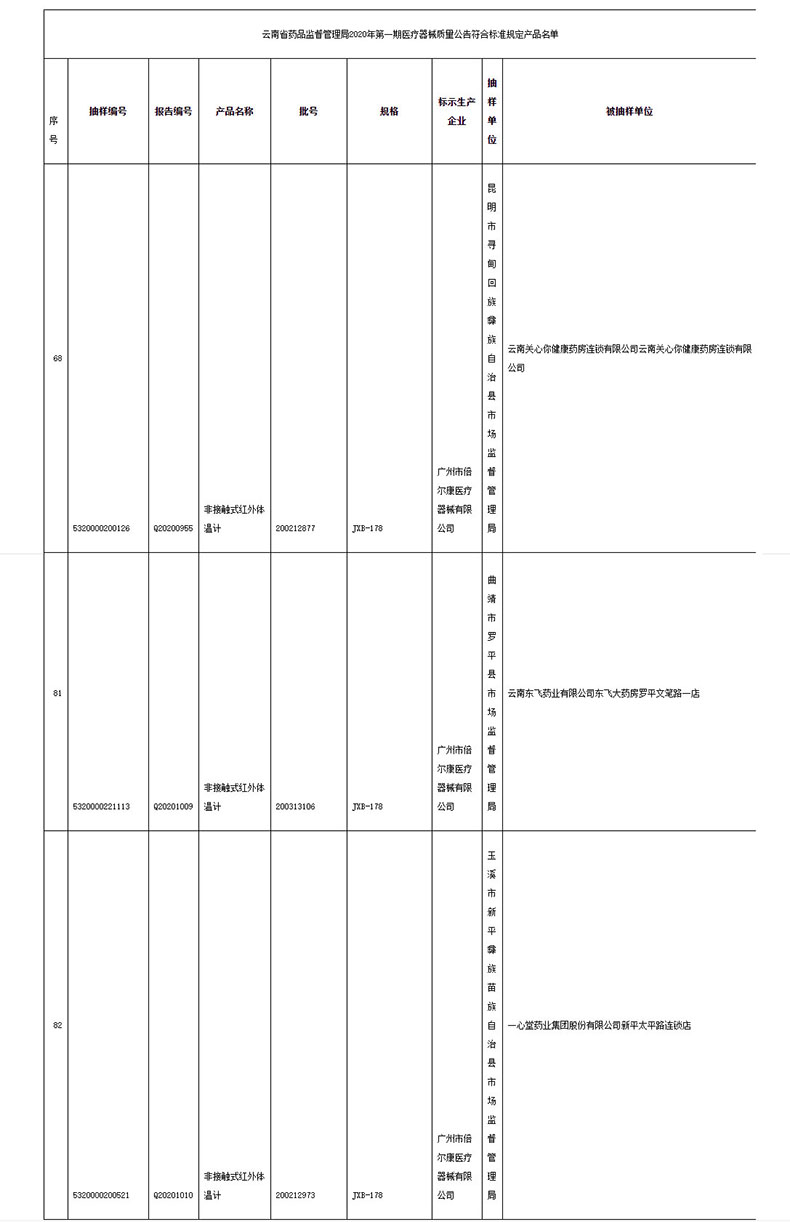 日前,云南省藥品監督管理局發布2020年第一期醫療器械質量公告,倍爾康的非接觸式紅外體溫計JXB-178被抽樣檢查,并順利通過質量監督!