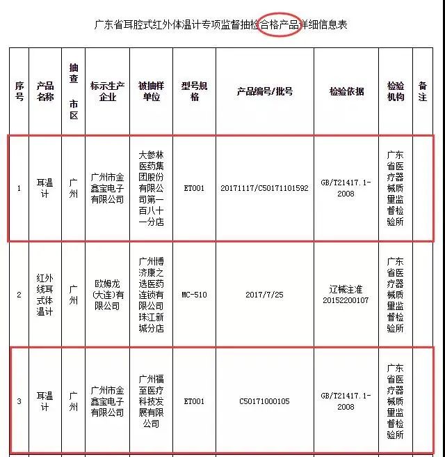 2019年的5月, 廣東省藥監局對市場上的醫療器械產品進行抽查,倍爾康耳溫計ET001也在合格名單上!