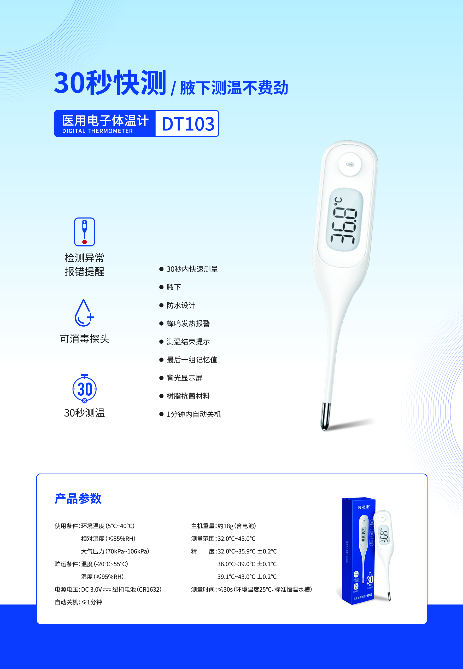 30秒快速測溫,聲光提示,誤測提醒